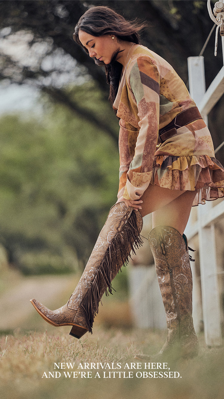 Z5496 - WOMEN'S STAMPED SUEDE WITH FRINGE SAND TALL TOP POINTED TOE LAMB COWBOY BOOT$269.00 /No reviews -