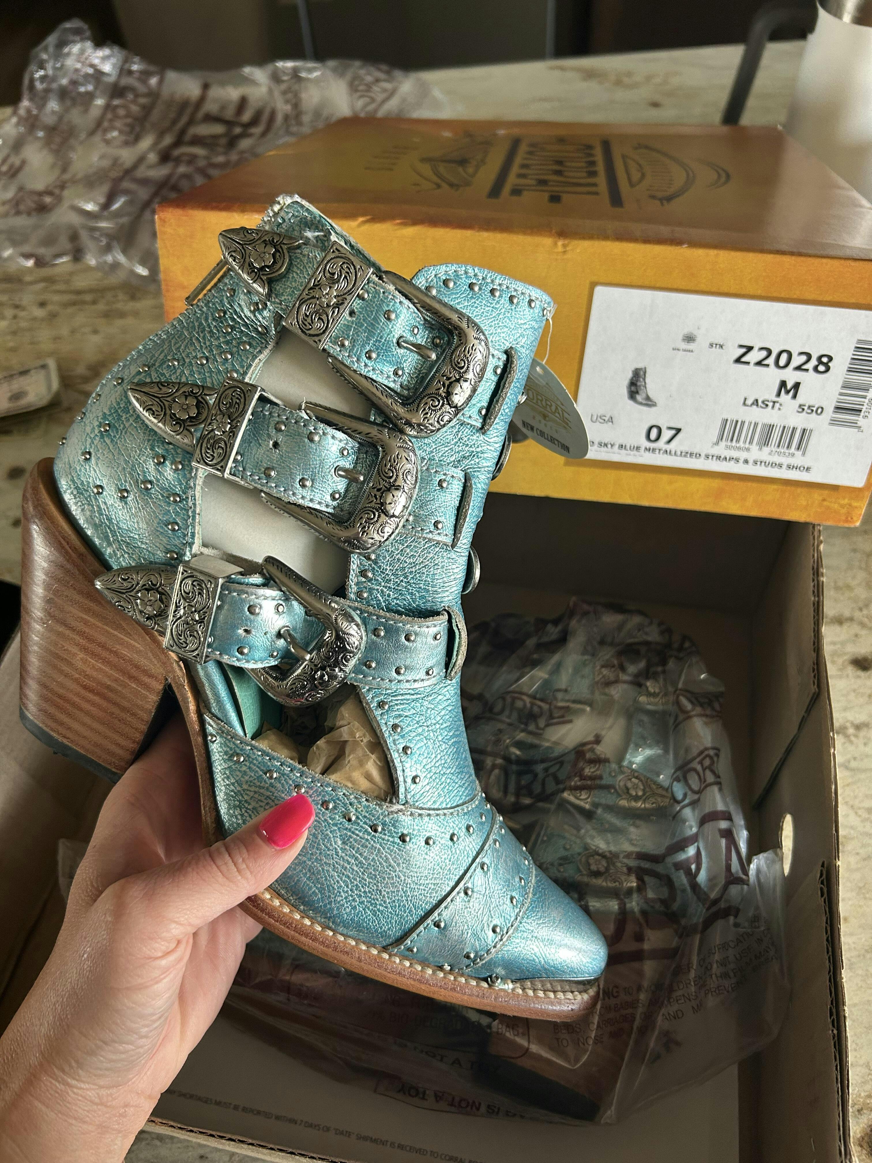 Z2028 - WOMEN'S SKY-BLUE METALIZED STRAPS AND STUDS POINTED TOE SHOE