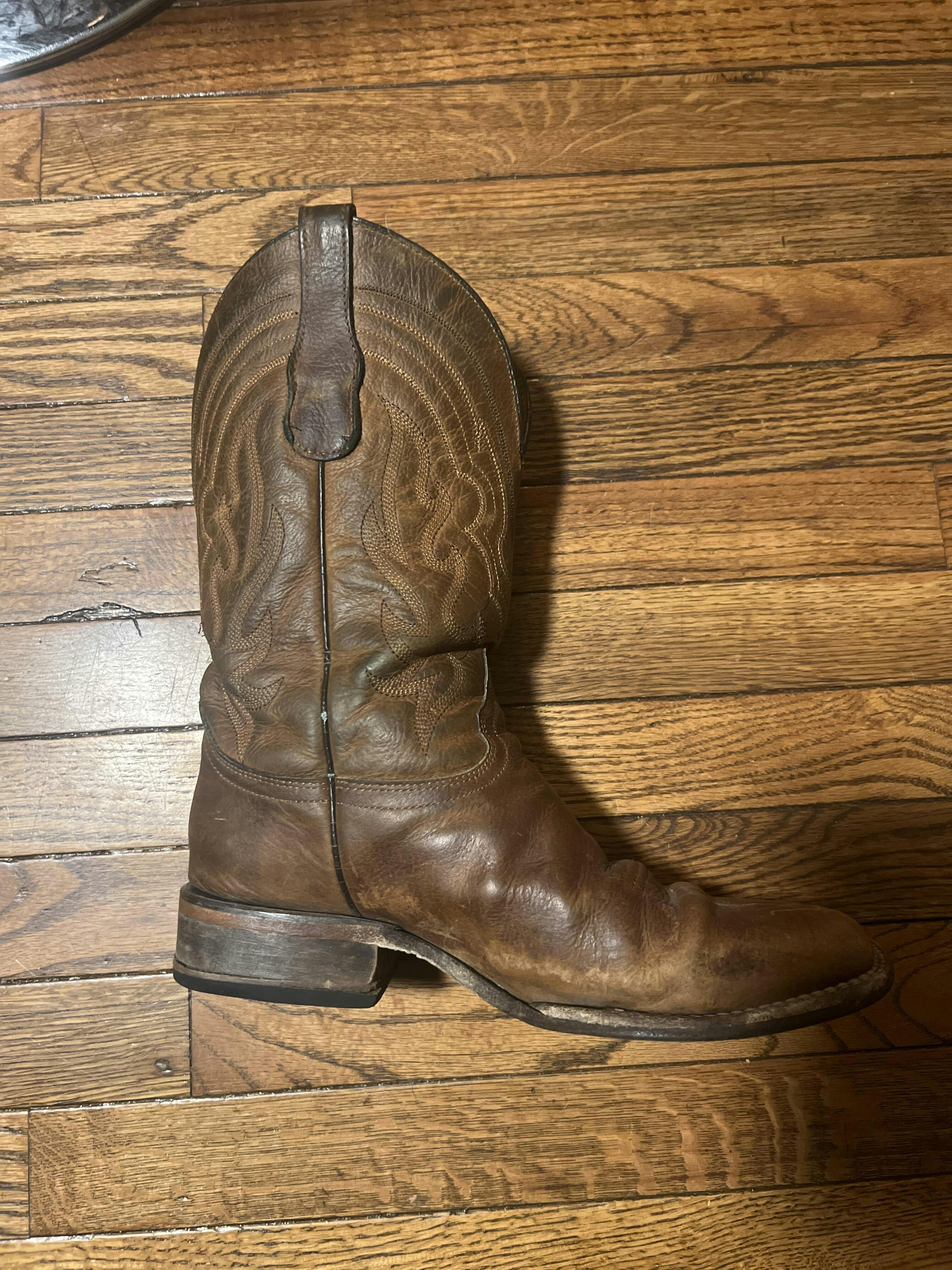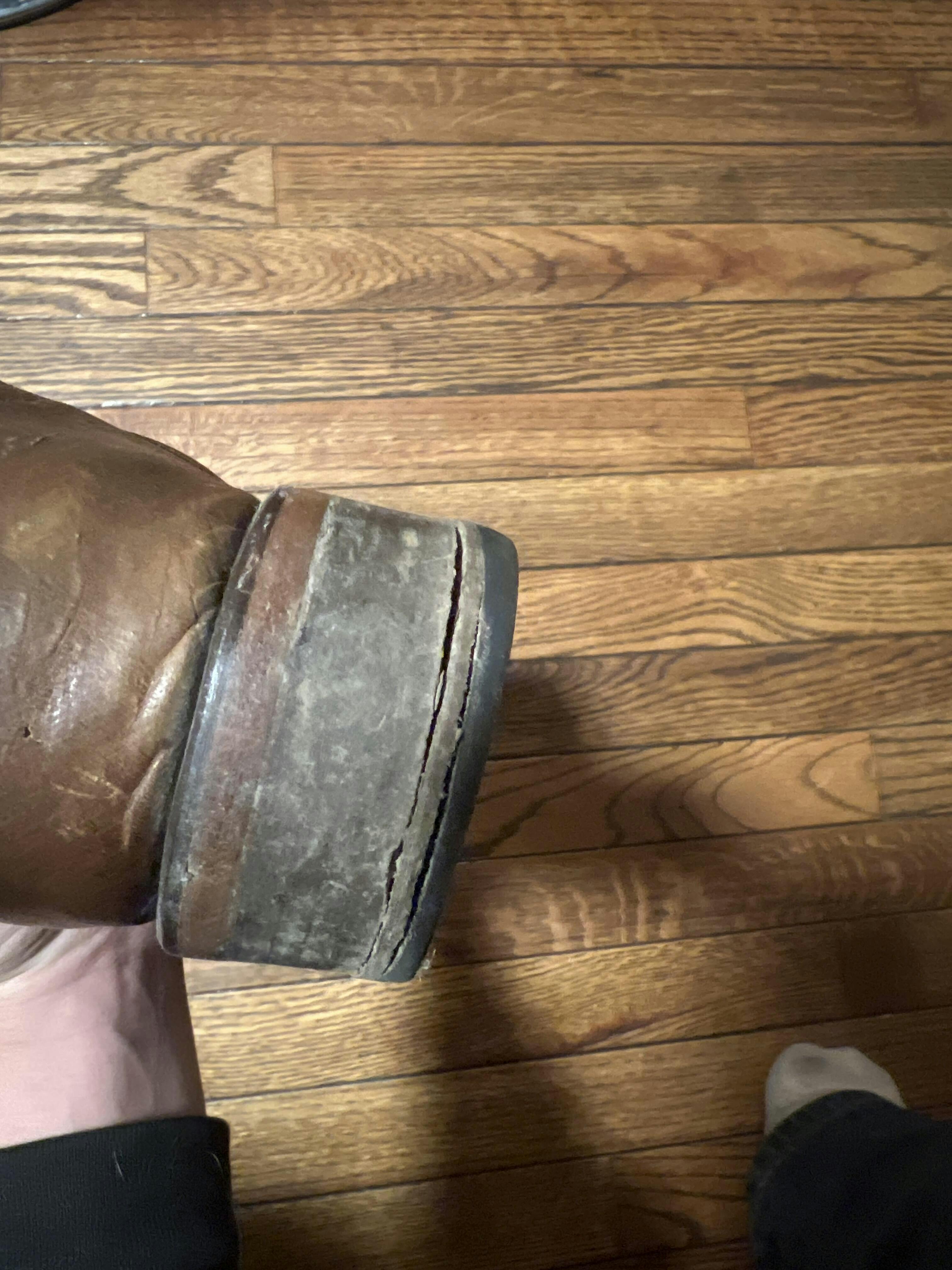 At the end of the day, wipe off any loose dust, dirt, or foreign debris. It is abrasive to all types of leather, failure to properly clean the soles, heels, or stitching will eventually cause the leather to weaken causing splits or cracks to occur ruining the overall appearance of the boot. Use a very soft brush or a damp cloth to remove dust, dirt, and debris from crevices, stitching, heels, shaft, vamp, and soles. You may use a slightly damp sponge to remove heavy mud on caked areas where mud has dried. Do not use solvents, gasoline, household, or industrial cleaners to try and remove stains. Do not soak or wash the boots in heavy running water. Remove any excess water as soon as possible with a soft dry cloth and allow to air dry. Do not leave your boots in front of a fireplace, stove, oven, or direct sun, or use a hair dryer to dry. Not doing so could result in mold, discoloration, or premature deterioration of the leather or skin.