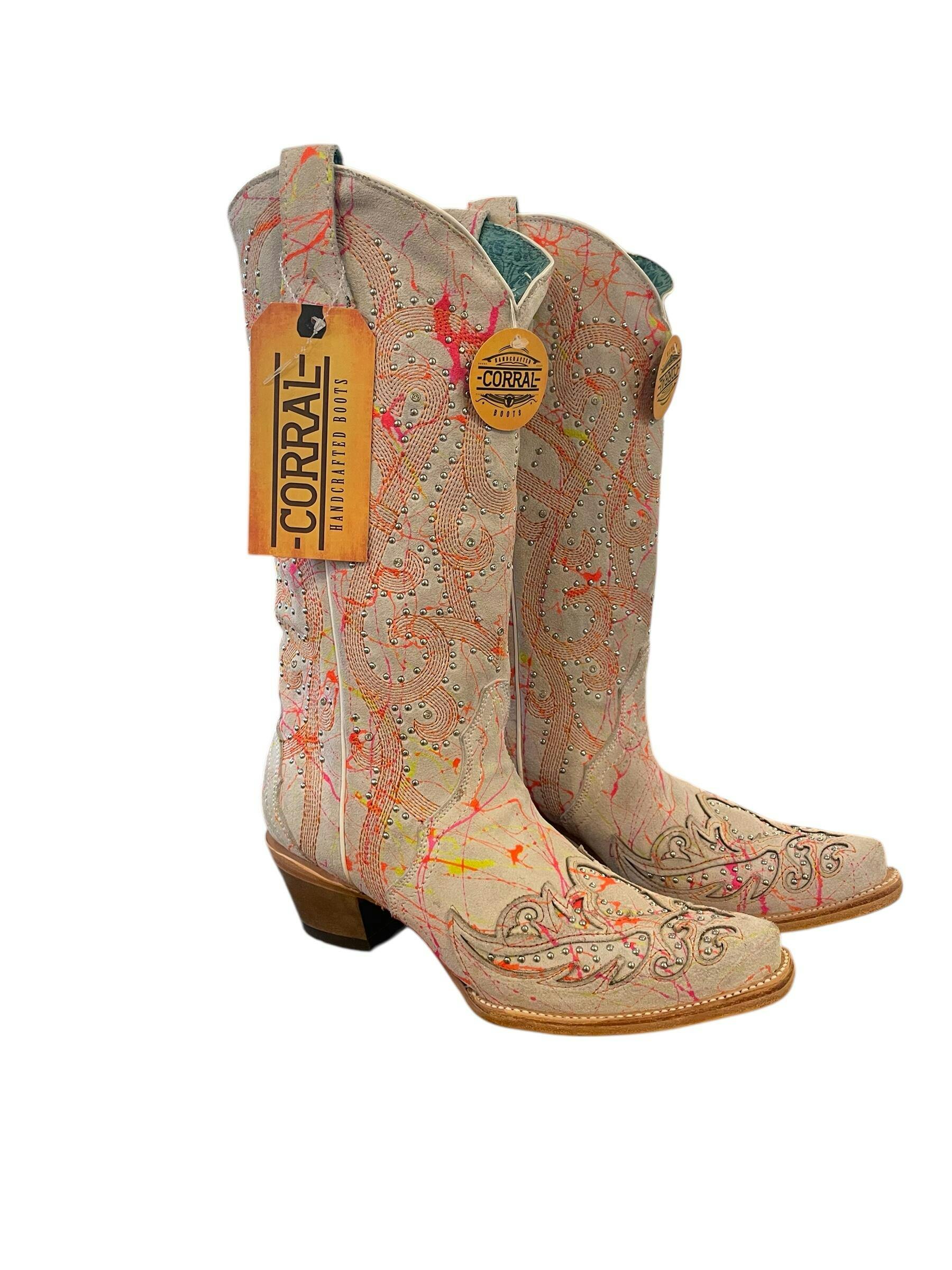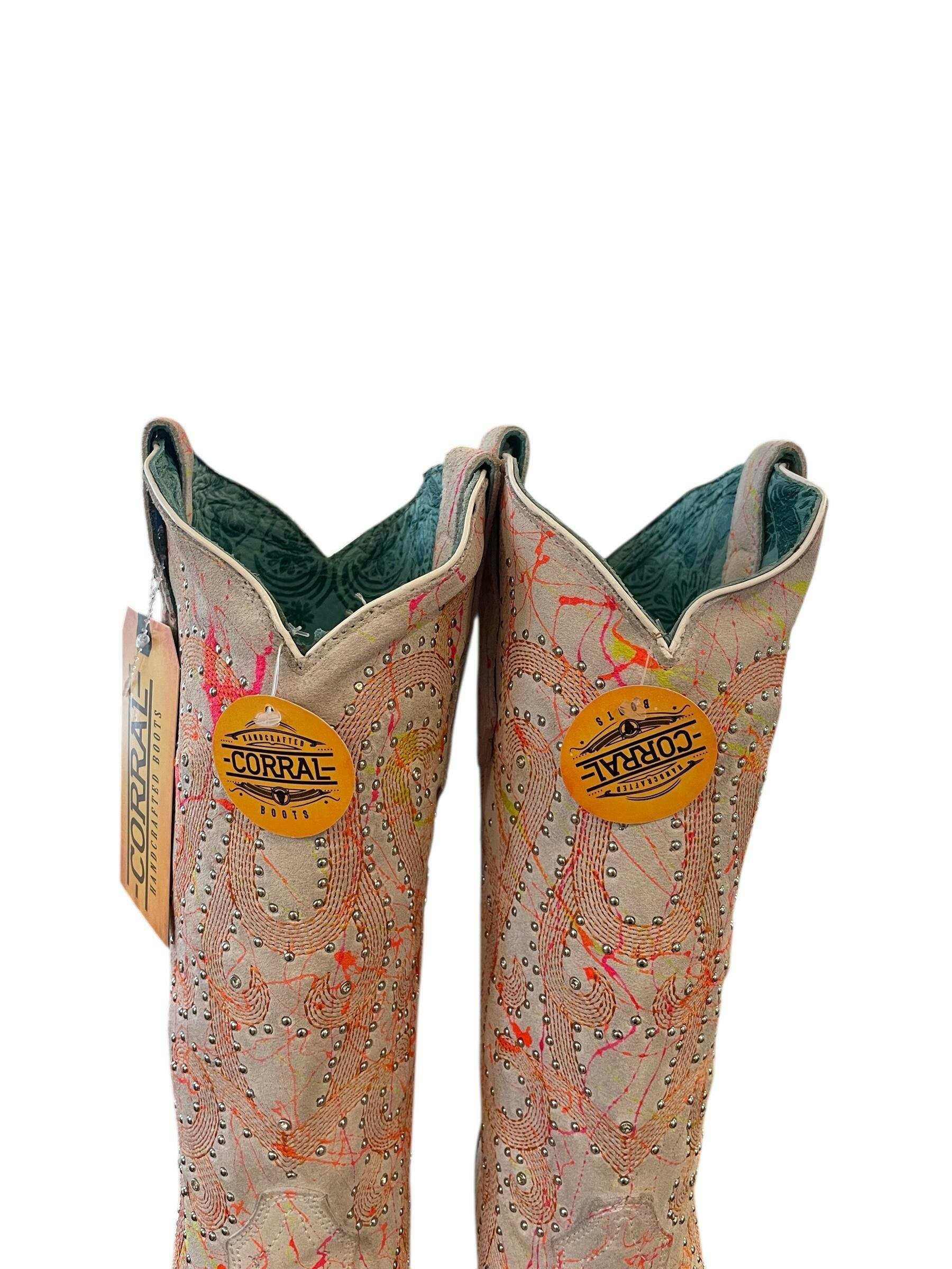 C3980 - WOMEN'S MULTICOLOR FLUORESCENT NEON ORANGE EMBROIDERY AND CRYSTALS WHITE SNIP TOE COWBOY BOOT