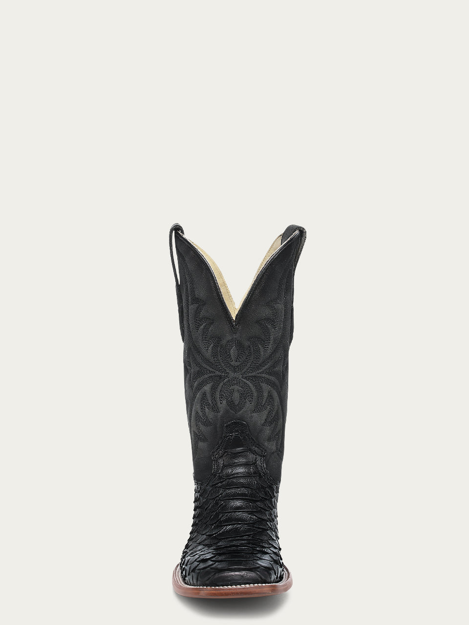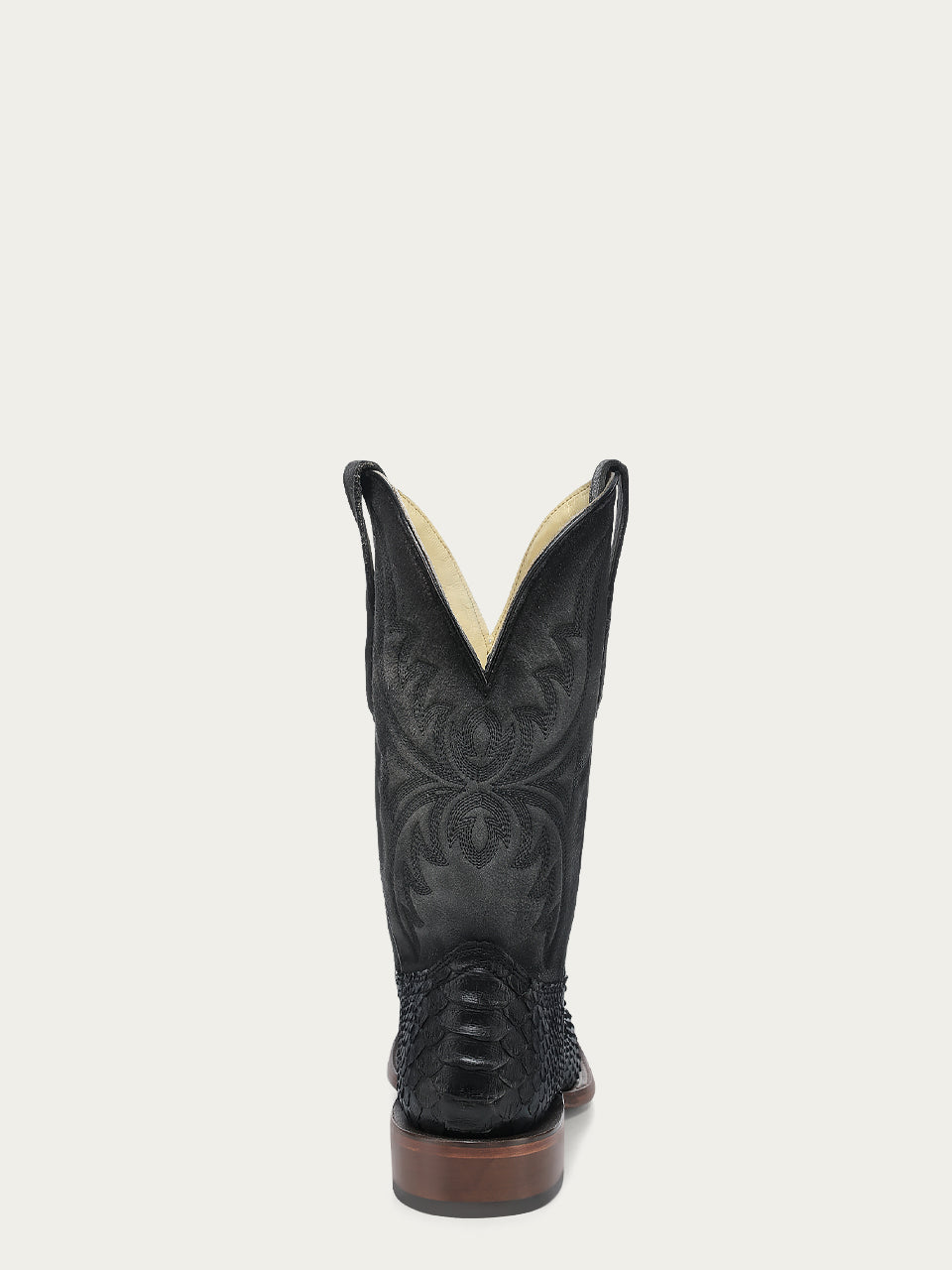 The 11-inch shaft features an embroidered pattern of a classic Western style and genuine python, making these boots perfect whether in the city or the countryside.