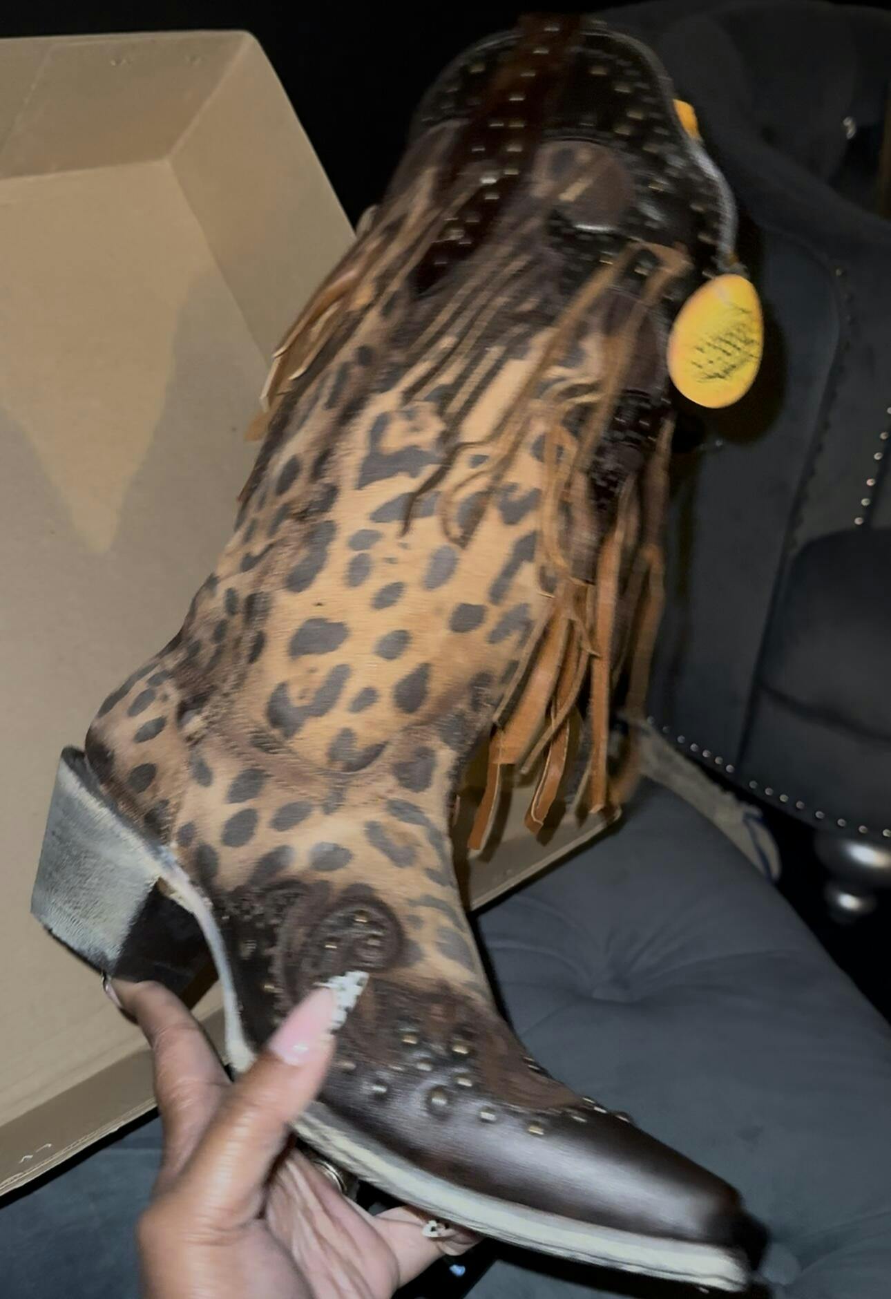 A3618 - WOMEN'S LEOPARD PRINT WITH FRINGE AND STUDS SNIP TOE COWBOY BOOT