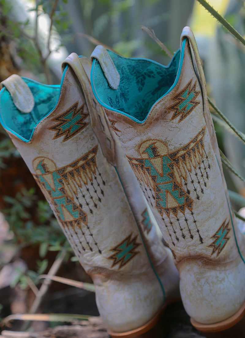 A4850 - WOMEN'S FLORAL AND HORSE-SHOE EMBROIDERY, WOVEN AND OVERLAY COWHIDE AND OSTRICH SQUARE TOE IVORY COWBOY BOOT