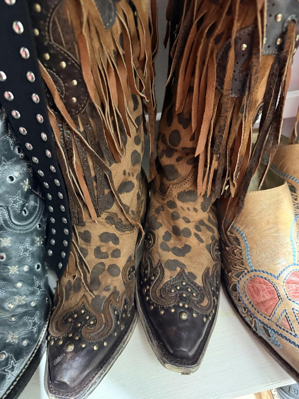 A boot that will never go out of style, the 13-inch shaft of leopard print with black overlay, and ever fun fringe with copper color studs give this boot their trendy western flair.