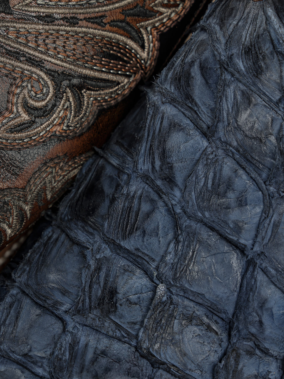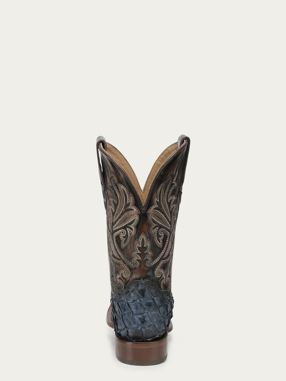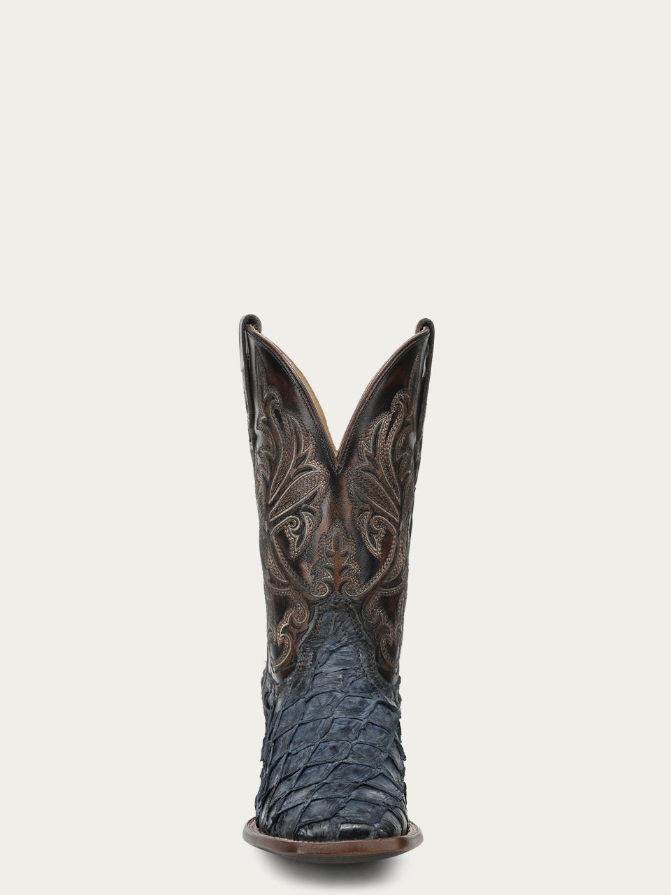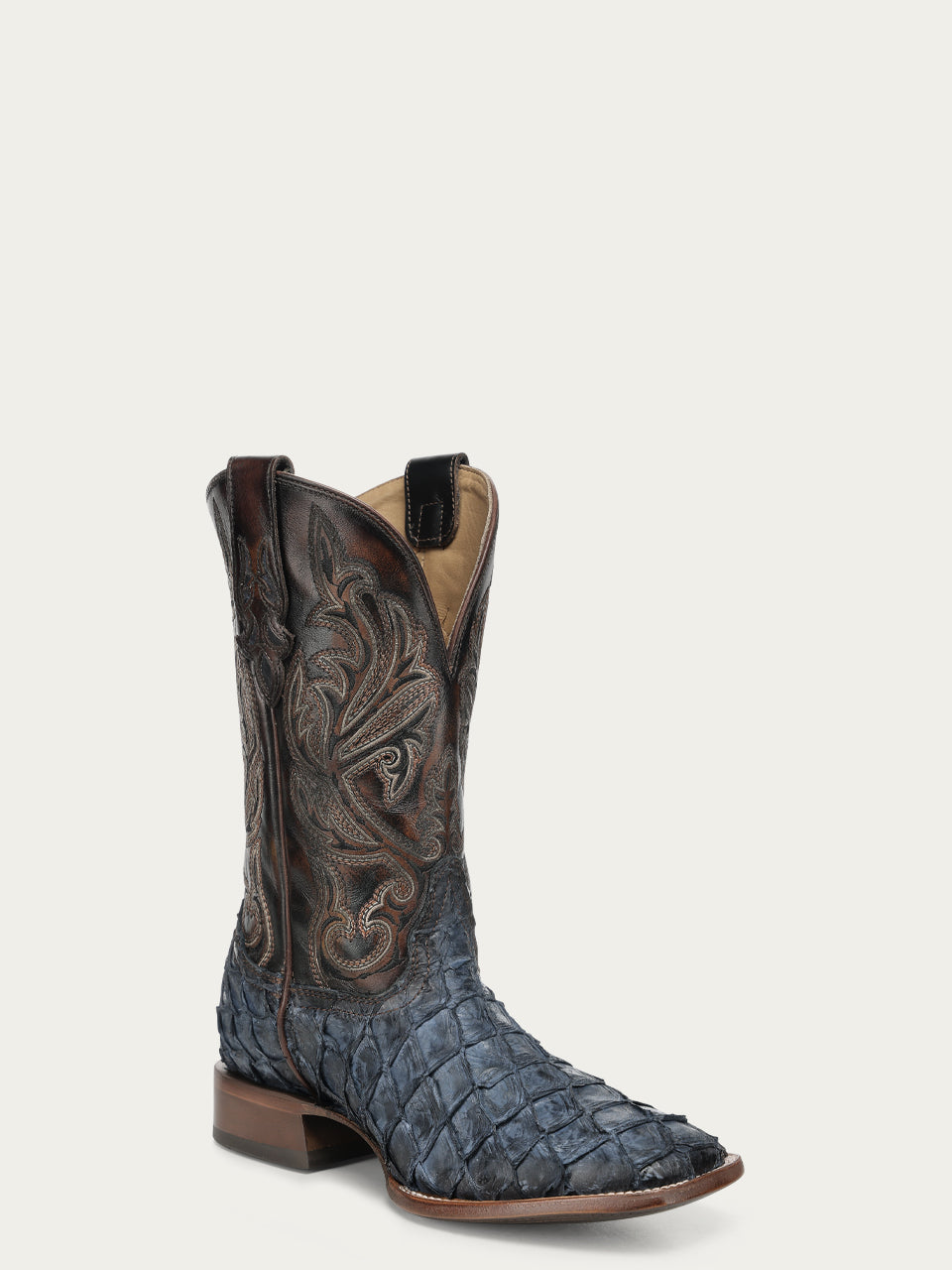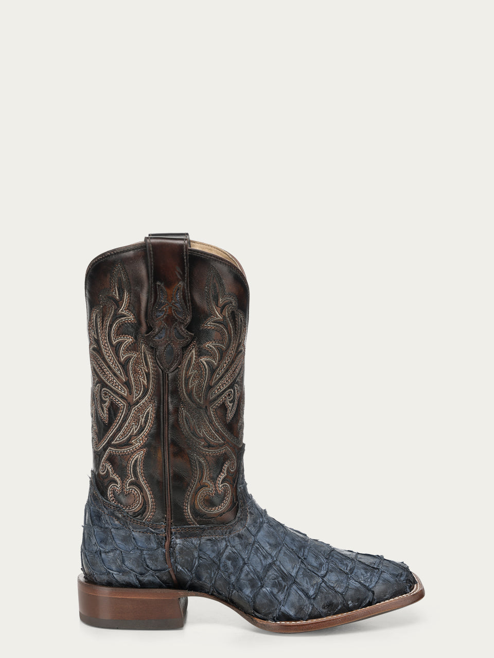 A5056 - MEN'S BLUE PIRARUCU EMBROIDERY BROWN COWHIDE WIDE SQ. TOE COWBOY BOOT