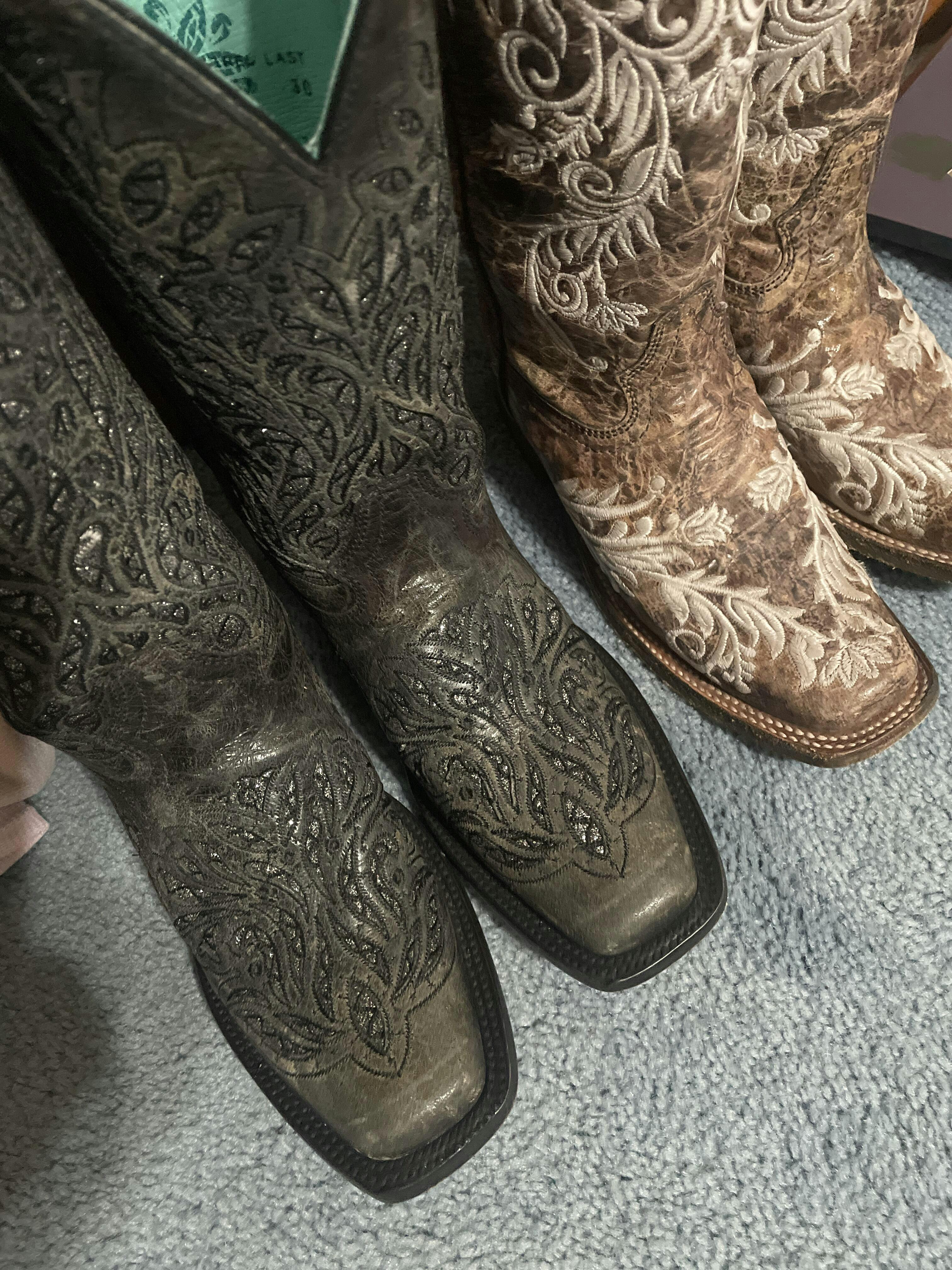 Boot creams come in many different colors as well as neutral for hard-to-match colors and may contain conditioning agents as well. Apply with a soft cloth or your fingers, using thin layers and multiple applications allowing the boots to absorb the boot cream. This provides a fresh new look and prevents the leather from drying out. You may also want to use boot cream around the edges of the sole and heel to restore worn or scuffed areas. Boot cream or polish is not recommended for scaled boots such as rattlesnake or python.