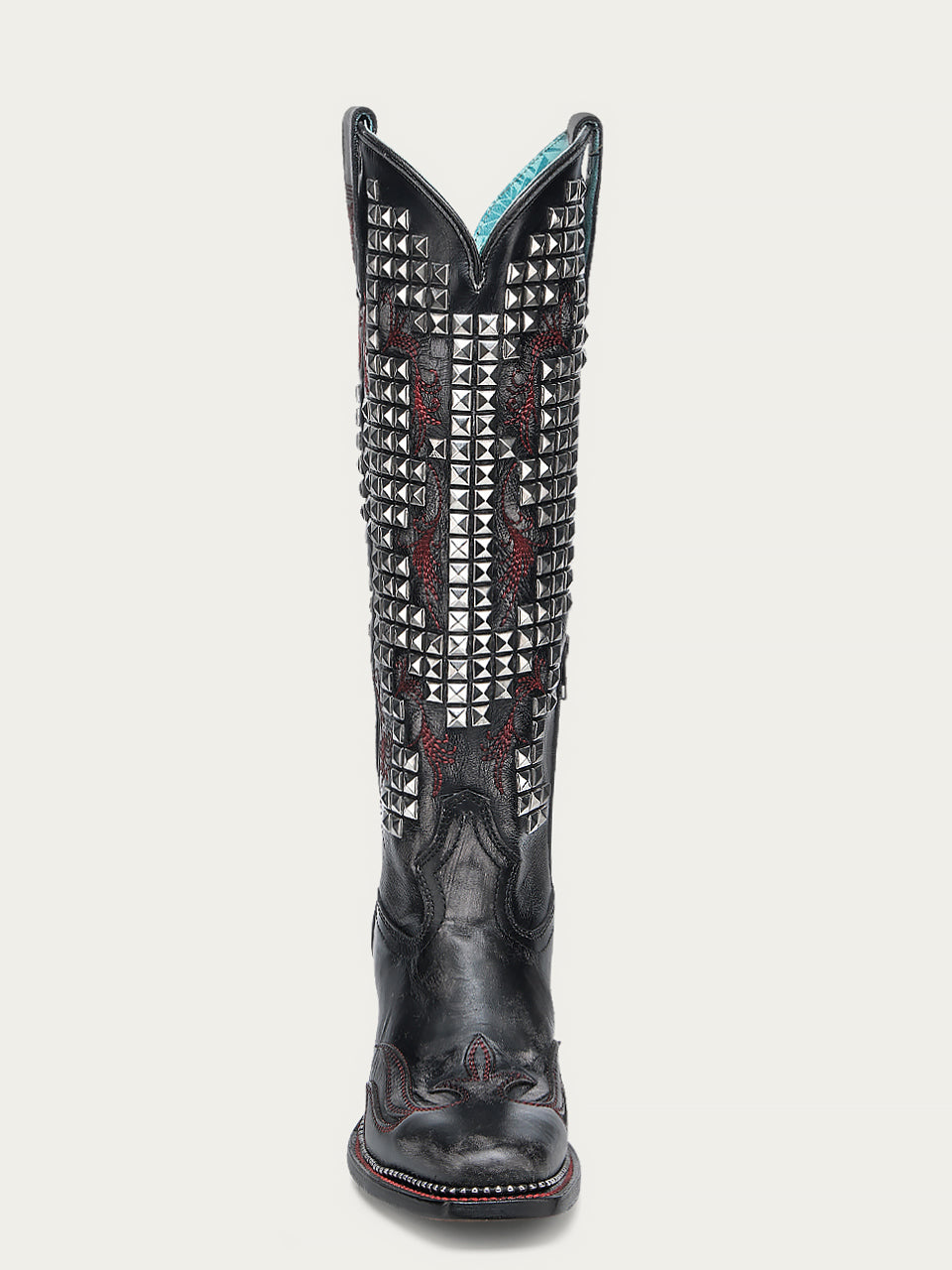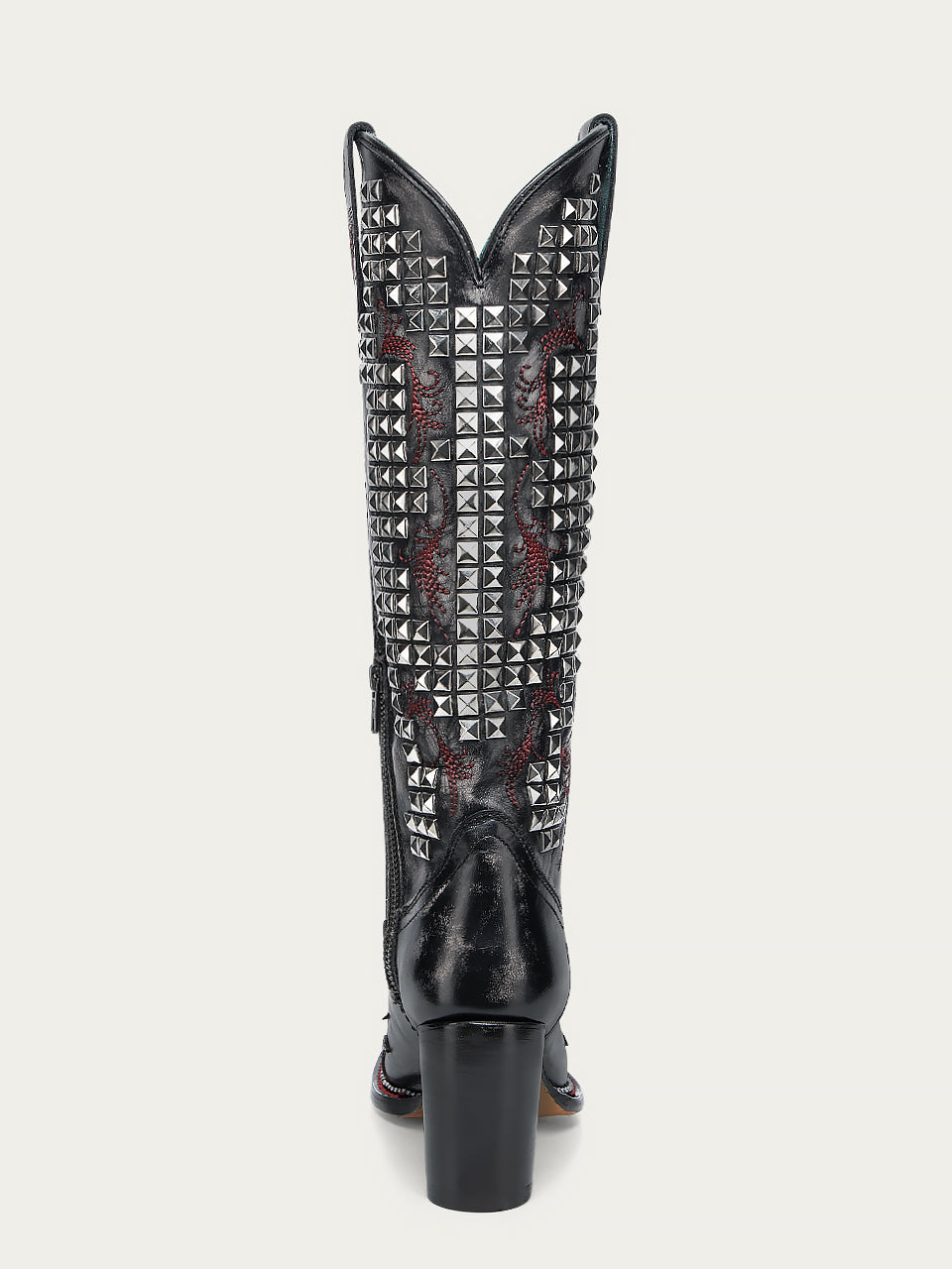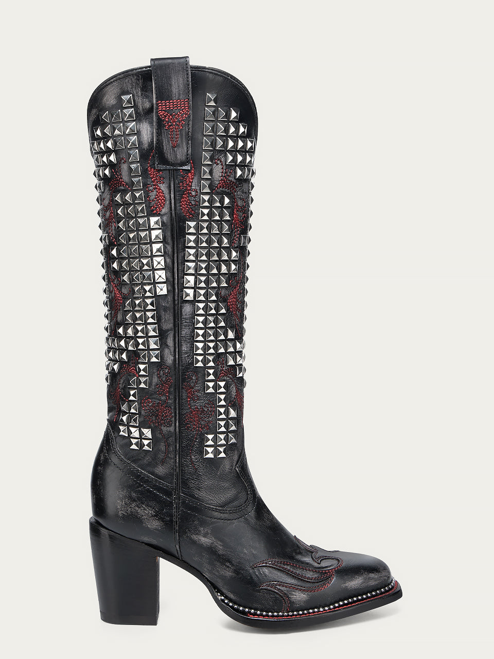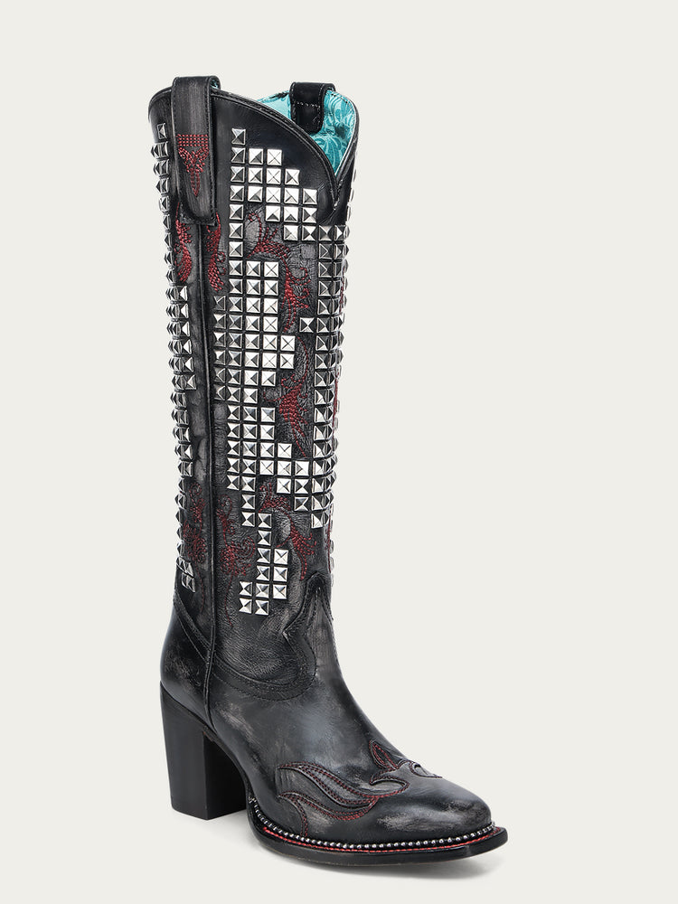 A4945 - WOMEN'S BONE OVERLAY EMBROIDERY AND STUDS BLACK NARROW SQUARE TOE TALL TOP COWBOY BOOT