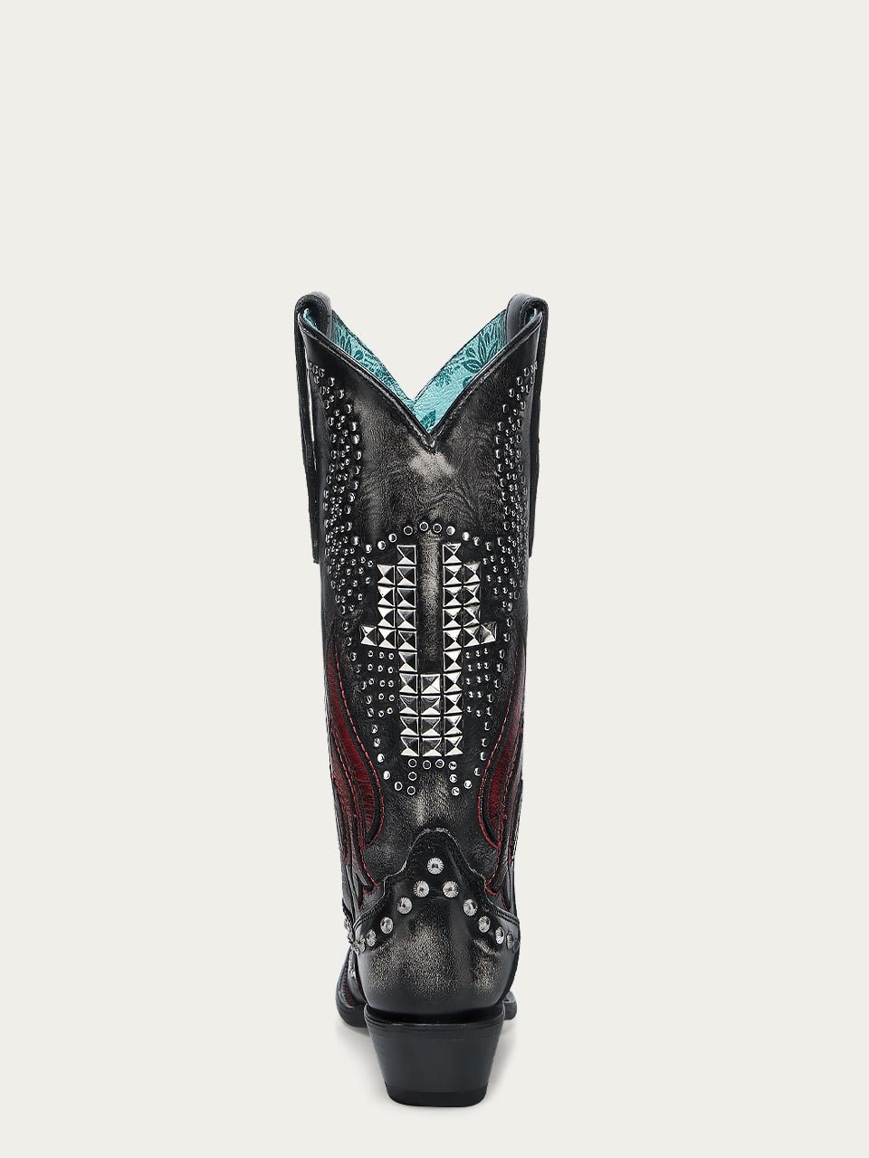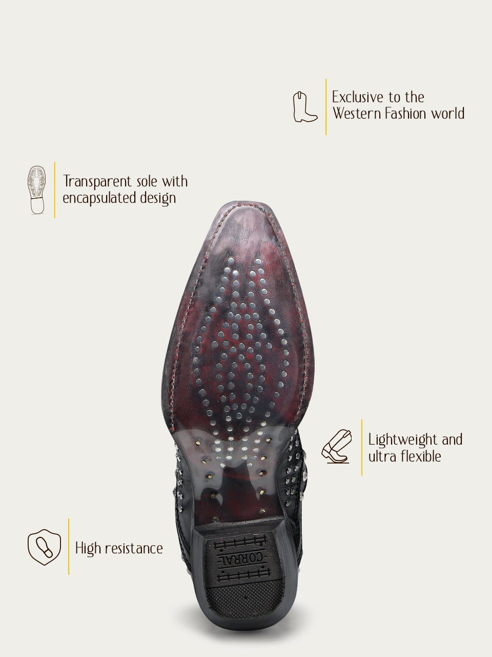 A4833 - WOMEN'S BONE OVERLAY EMBROIDERY AND STUDS BLACK SNIP TOE COWBOY BOOT
