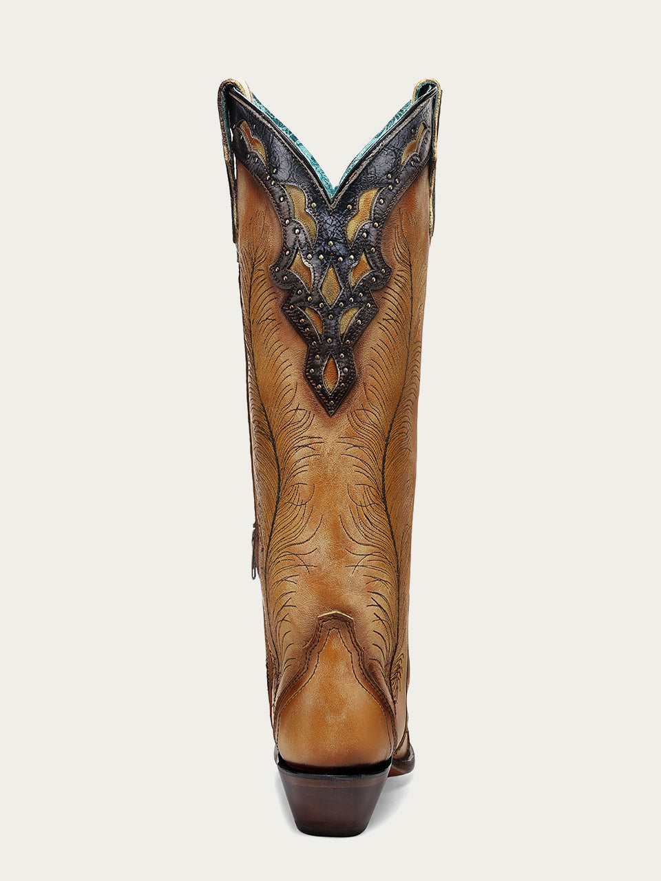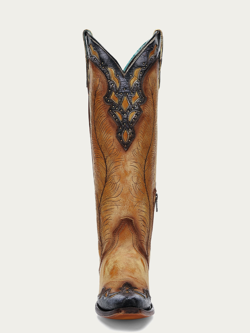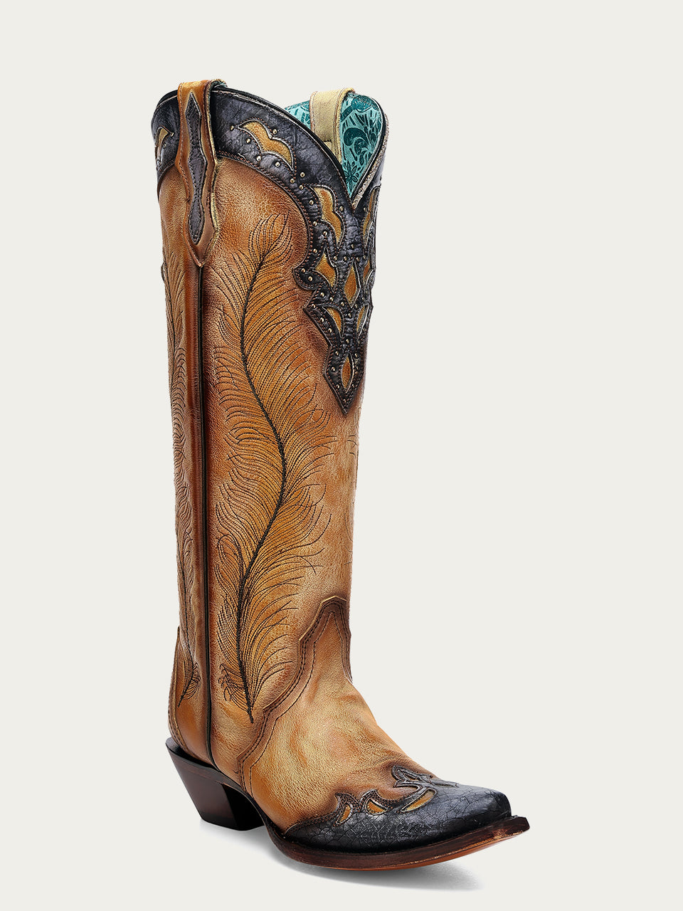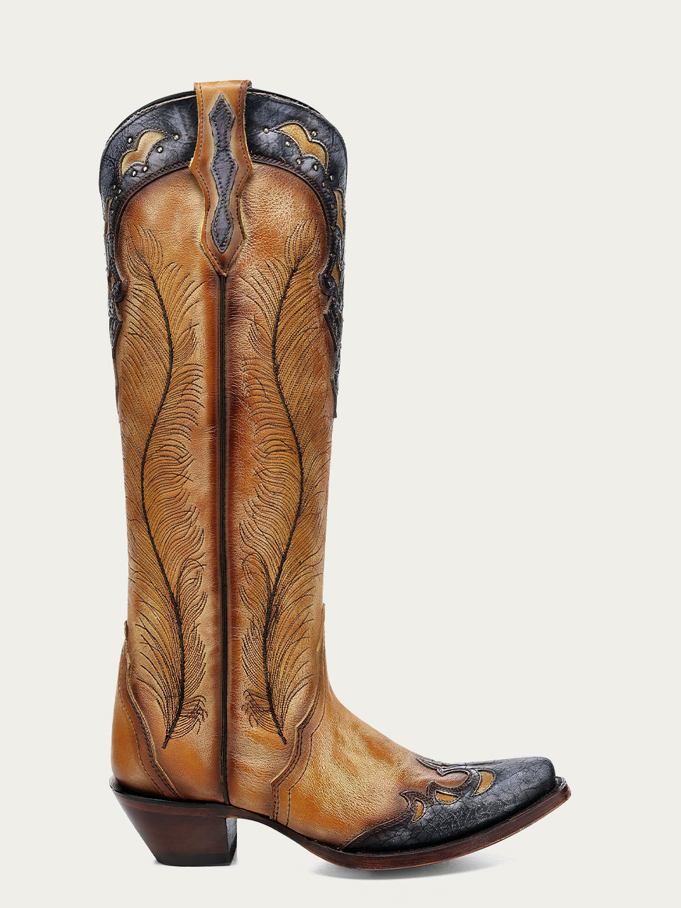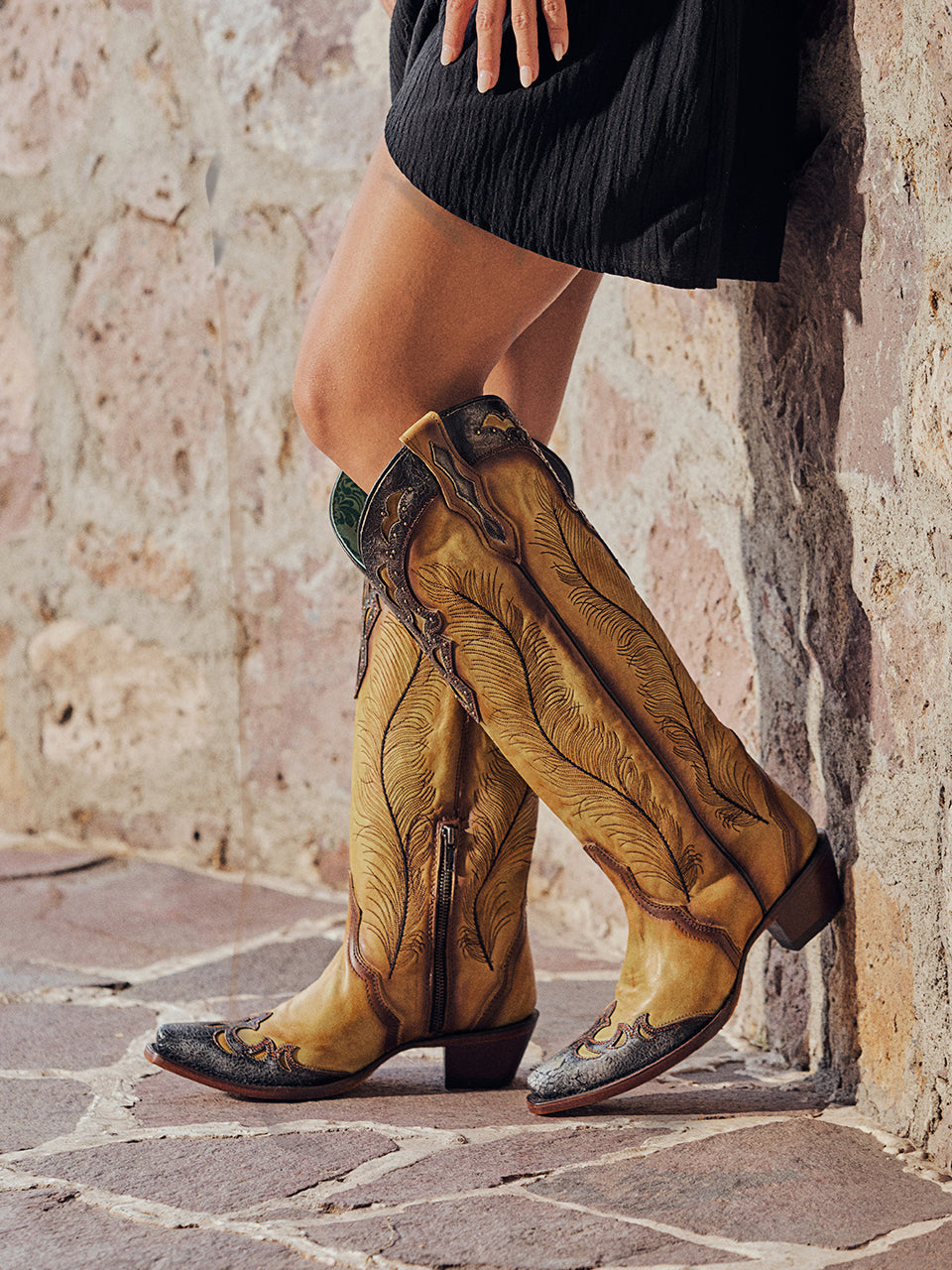 A4765 - WOMEN'S FEATHER EMBROIDERY WITH CRACKLED OVERLAY AND STUDS YELLOW SNIP TOE COWBOY BOOT