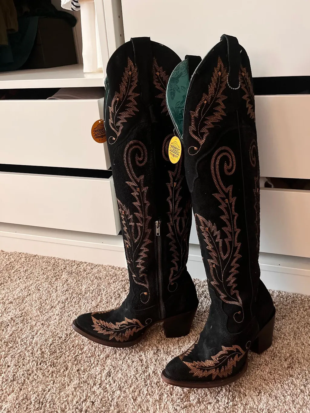 A4404 - WOMEN'S GOLD EMBROIDERY BLACK SUEDE TALL TOP J TOE COWBOY BOOT