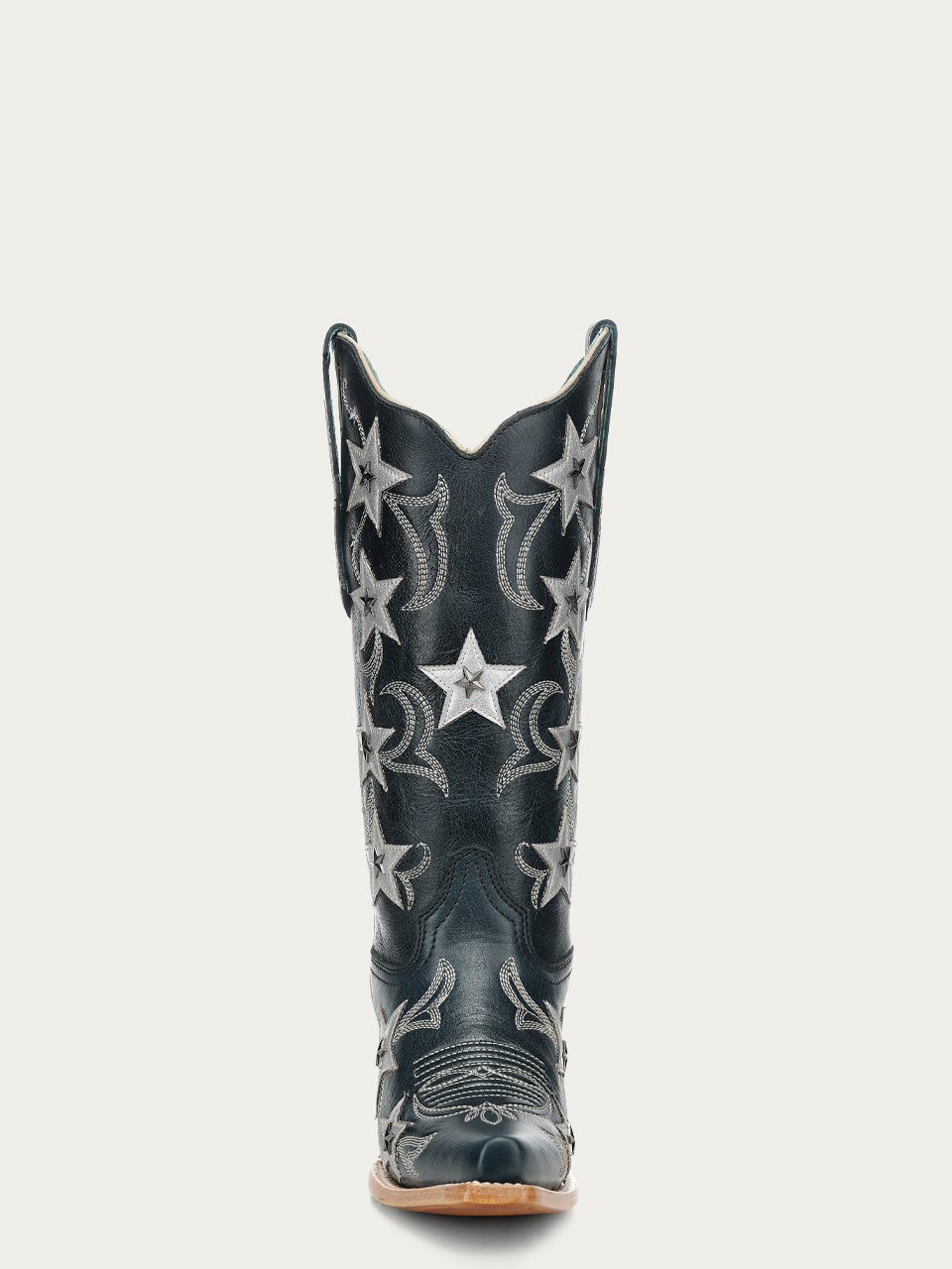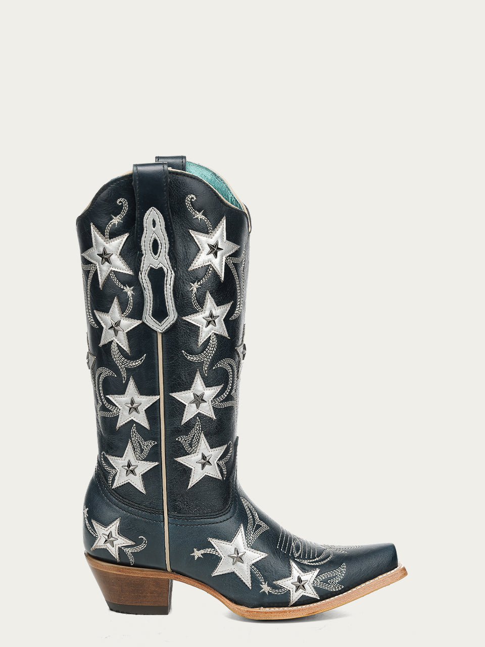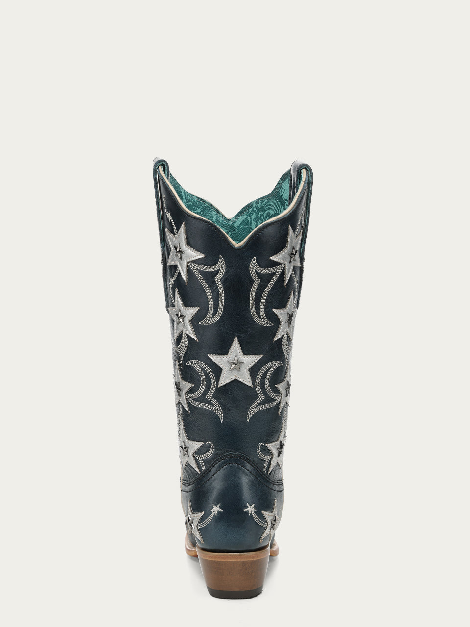 Z5541 - WOMEN'S NAVY BLUE EMBROIDERY STARS OVERLAY AND STUDS SNIP TOE COWBOY BOOT